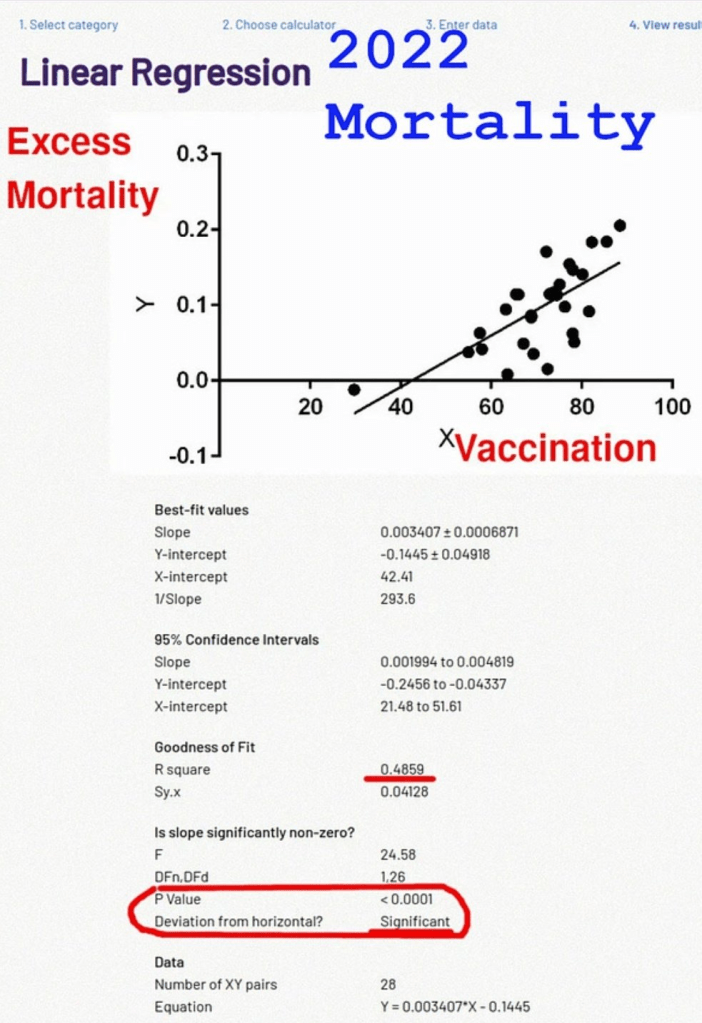 Il s’avère que les taux de vaccination contre le COVID-19 sont associés à une mortalité accrue de 25 %, et l’association est hautement statistiquement significative avec la valeur P de 0,0131, ce qui montre qu’il est peu probable qu’il s’agisse d’un résultat du hasard.