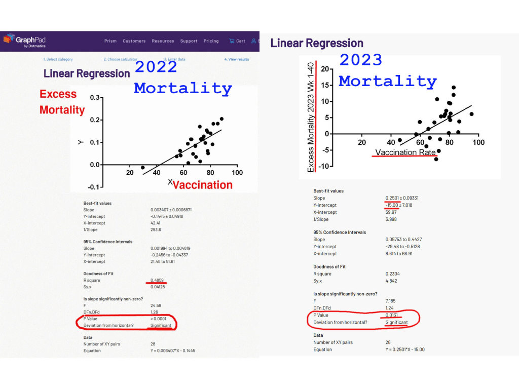 Les similitudes entre les relations entre les taux de vaccination et la surmortalité en 2023 et 2022 ( données 2022 discutées ici ) sont frappantes :