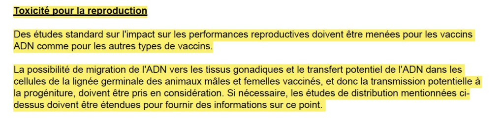 « L’ADN plasmidique internalisé par les cellules de l’animal vacciné peut s’intégrer dans les chromosomes de l’animal vacciné et perturber l’état réplicatif normal de cette cellule, provoquant une division cellulaire incontrôlée et une oncogenèse » […] La probabilité qu’une molécule d’ADN s’intègre dans le chromosome est faible et étant donné que l’oncogenèse est un événement multifactoriel, le risque de mutagenèse insertionnelle est extrêmement faible. Des études d’intégration, le cas échéant, doivent être entreprises avec le produit fini et le pourcentage de plasmide surenroulé utilisé doit être indiqué. Jusqu’à présent, l’intégration de l’ADN plasmidique dans l’ADN chromosomique d’un animal vacciné n’a pas été observée (EFSA, EFSA Journal 2017). Cependant, l’intégration (par exemple dans les cellules musculaires entourant le site de vaccination ou dans les cellules de la lignée germinale des gonades) ne peut être écartée. »