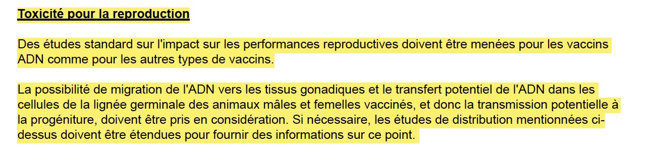 « L’ADN plasmidique internalisé par les cellules de l’animal vacciné peut s’intégrer dans les chromosomes de l’animal vacciné et perturber l’état réplicatif normal de cette cellule, provoquant une division cellulaire incontrôlée et une oncogenèse » […] La probabilité qu’une molécule d’ADN s’intègre dans le chromosome est faible et étant donné que l’oncogenèse est un événement multifactoriel, le risque de mutagenèse insertionnelle est extrêmement faible. Des études d’intégration, le cas échéant, doivent être entreprises avec le produit fini et le pourcentage de plasmide surenroulé utilisé doit être indiqué. Jusqu’à présent, l’intégration de l’ADN plasmidique dans l’ADN chromosomique d’un animal vacciné n’a pas été observée (EFSA, EFSA Journal 2017). Cependant, l’intégration (par exemple dans les cellules musculaires entourant le site de vaccination ou dans les cellules de la lignée germinale des gonades) ne peut être écartée. »