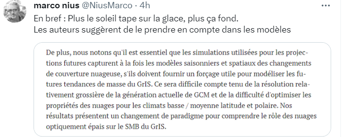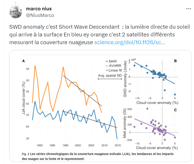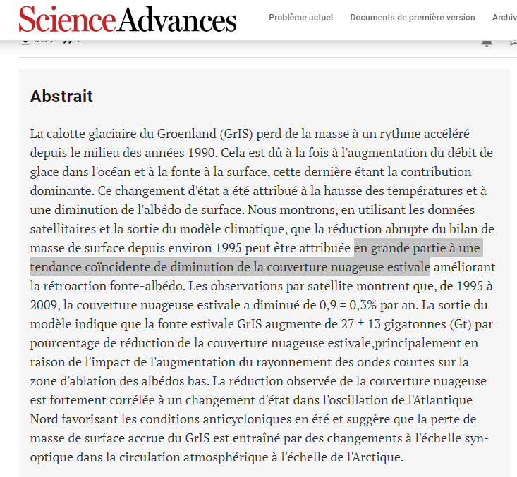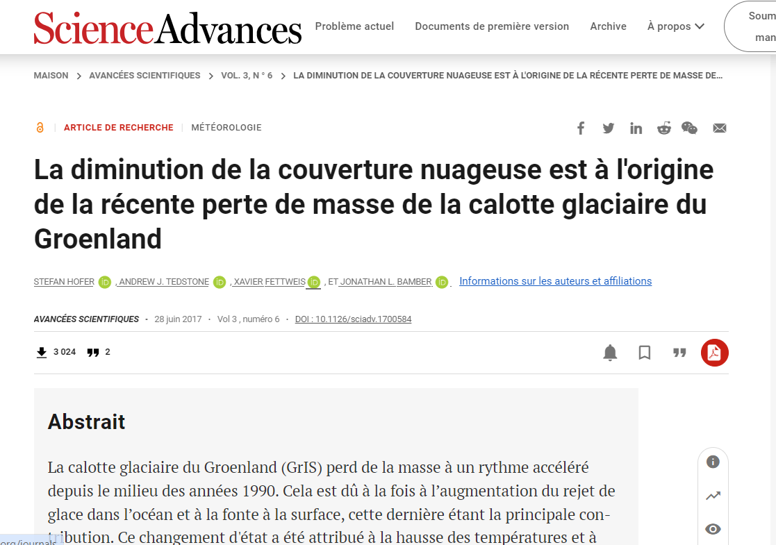 La fonte du Groenland depuis 1990 est la principale contributrice à la montée des eaux avec 0.47 +/- 0.23 mm/an. En 2017 ils découvrent que ça n’est pas dû aux températures mais en majeure partie la baisse de la couverture nuageuse. Ils n’en feront pas les gros titres
