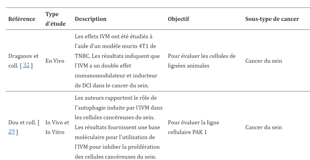 Deux ans avant Covid, les chercheurs ont analysé des données publiées suggérant fortement que l’ivermectine pourrait être réutilisée, c’est-à-dire utilisée à un autre usage non autorisé, pour le cancer. Dans une vingtaine d’études en laboratoire, il a été démontré que l’ivermectine inhibait la prolifération cellulaire et induisait « l’apoptose » – la mort cellulaire – dans les lignées cellulaires cancéreuses du sein, de la prostate, de l’ovaire, de la tête et du cou, du côlon et du pancréas. Dans six études chez la souris, le médicament s’est révélé efficace contre le glioblastome, la leucémie et le cancer du sein et du côlon. Sur la base de ces études, des prédictions ont été faites selon lesquelles l’ivermectine pourrait être utilisée rapidement et en toute sécurité.