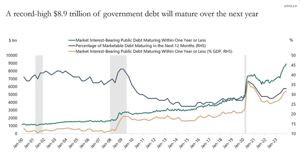 Des problèmes pour la dette publique américaine: 1400 mds de S de déficit 2024 à financer par emprunt mais surtout 8,9 000mds de dette mature arrivée à échéance . Au total 10 000 mds de s à faire financer par l’étranger….