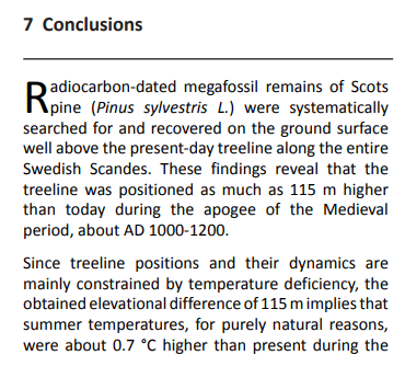 « Compte tenu de la plage obtenue de changement de la limite forestière et changement climatique associé déduit au cours du passé, il est difficile de considérer du réchauffement climatique actuel comme n’étant pas naturel. » https://diva-portal.org/smash/get/diva2:1783768/FULLTEXT01.pdf
