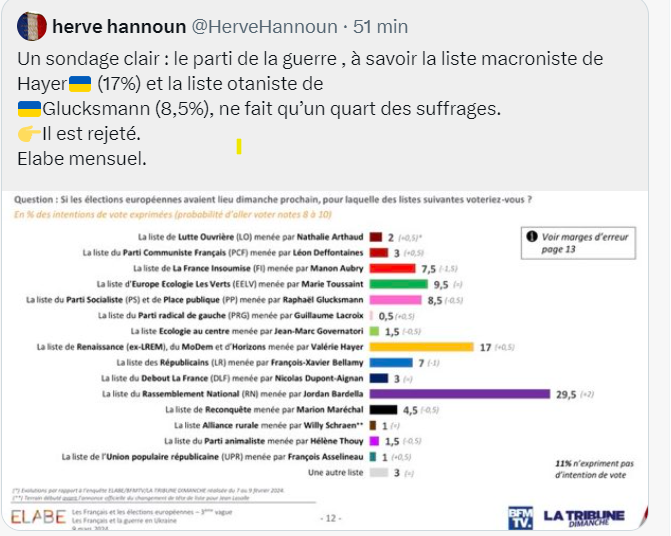 Tout ce qui interesse nos politicards c’est qui sera élu aux européennes. La place doit être bonne pour ne pas vouloir la lâcher à ce point. Le fait qu’ils nous poussent à une guerre qui sera au moins européenne ne les effleure même pas. Ils sont dans le délire total et risquent de nous entraîner au fond avec eux.