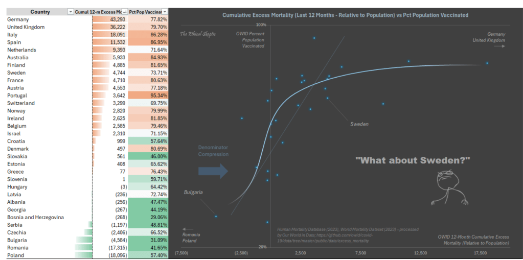 Surmortalité cumulée (12 derniers mois – par rapport à la population) par rapport au pourcentage de population vaccinée – (cliquez sur l’image pour l’agrandir) – une fois le bruit éliminé des ensembles de données nationales sur la mortalité, il est devenu tout à fait clair que la surmortalité n’était pas linéairement proportionnelle à la mortalité. taux de vaccination par pays européen. La chute de la surmortalité en dessous de la ligne zéro de l’axe des x (mortalité excessive cumulée) est l’effet Pull Forward (PFE). La raison pour laquelle la courbe s’aplatit près de l’extrémité inférieure est que les pays dans cette section du graphique sont moins peuplés, ce qui entraîne une amplification du dénominateur de l’excès de mortalité cumulé (par rapport à la population) dans les données des pays plus petits. La surmortalité dans chaque pays est en réalité plus élevée que ne l’indiquent ces indices, et le lien avec le vaccin est étroit.