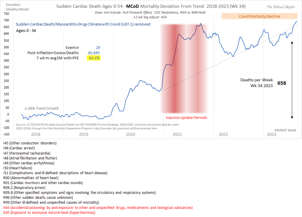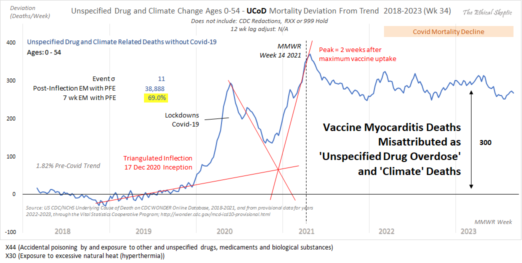 Surmortalité due aux surdoses de médicaments non spécifiées et au changement climatique – Oui, la combinaison des confinements et de la Covid-19 a entraîné une augmentation temporaire des surdoses de médicaments indéterminées. Cependant, il ne s’agit pas de données « tendancielles ». La tendance commence fin 2020 avec l’introduction du vaccin (qui culmine la semaine même de la vaccination maximale). La myocardite induite par le vaccin a rendu cette population vulnérable à une mort cardiaque subite – qui a ensuite été faussement attribuée à une surdose médicamenteuse. Cet excédent d’attribution, à la semaine 25 2023, est de l’ordre de 300 décès par semaine, pour « drogue non précise » et « climat ». Ce décompte est réintégré aux totaux de mortalité par mort cardiaque subite présentés dans le graphique DFT 10 ci-dessous. Cela suggère une augmentation alarmante de la mort cardiaque subite chez les jeunes.