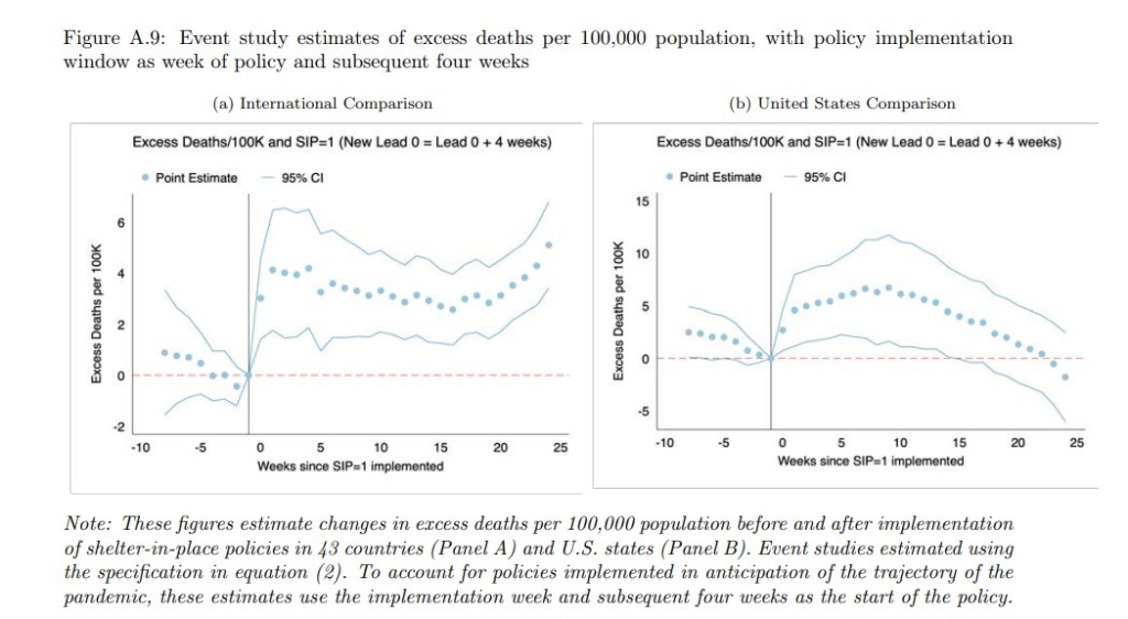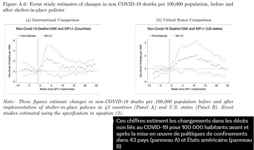 « nous constatons que la mise en œuvre du confinement était associée à une augmentation de la surmortalité Dans l’ensemble, les résultats suggèrent que la mise en œuvre des politiques SIP ne semble pas avoir atteint l’objectif de réduire la surmortalité ou les décès dus au COVID »