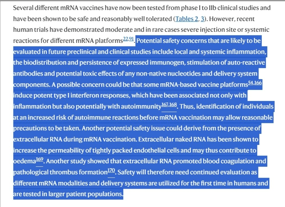 En 2018, Weissman, prix Nobel pour l’ARNm modifié, abordait les facteurs de risque de ces produits comme la biodistribution, persistence des protéines exprimées,la toxicité des ARNm mod., autoimmunité, thrombose, caillot sanguins