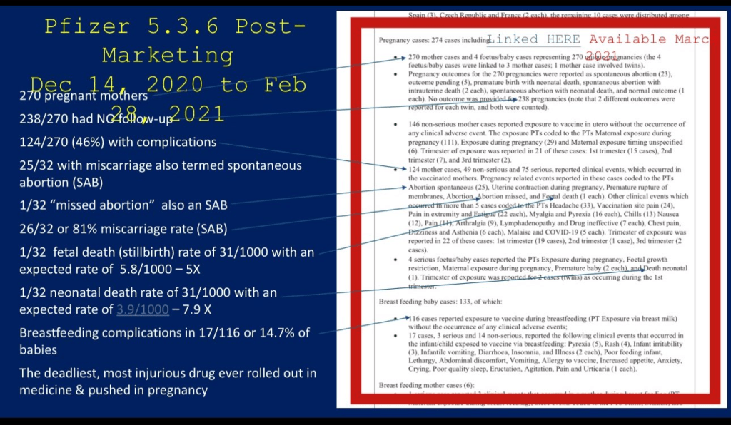Leurs données sont claires : le vaccin Covid a été le médicament le plus mortel et le plus nocif jamais utilisé dans l’histoire de la médecine, avec 42 086 victimes, dont 1 223 MORTS en seulement 10 semaines (page 7, photo ci-dessous) et des issues de grossesse catastrophiques (page 12, photo ci-dessous).
