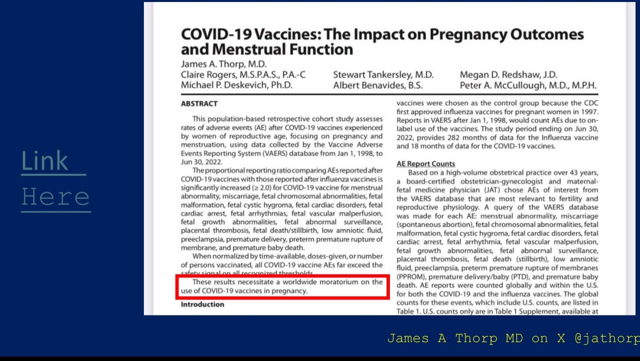 – – PERSONNE ne l’a réfuté ou contesté. Thorp JA, Rogers C; Deskevich, député, Tankersley S, Benavides A, Redshaw, MD ; McCullough, PA Vaccins COVID-19 : l’impact sur l’issue de la grossesse et la fonction menstruelle. Journal des médecins et chirurgiens américains printemps 2023 ; 28(1) https:// jpands.org/vol28no1/thorp .pdf …