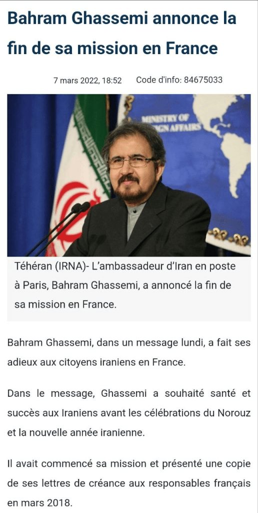 A condition même qu’il y soit encore, puisque des bruits courent (ah ces foutus réseaux sociaux !) qu’il aurait été « rappelé » à Téhéran. Resterait à savoir dans ce cas si rappel définitif (ça ne serait pas bon signe) ou simplement rappel pour venir prendre des consignes.