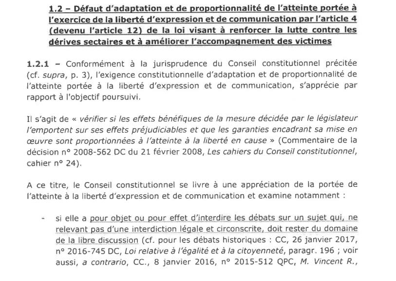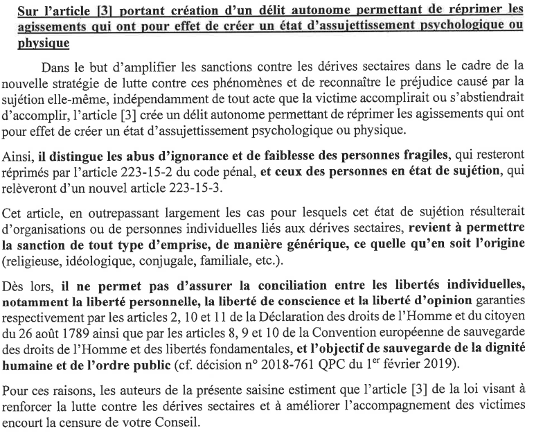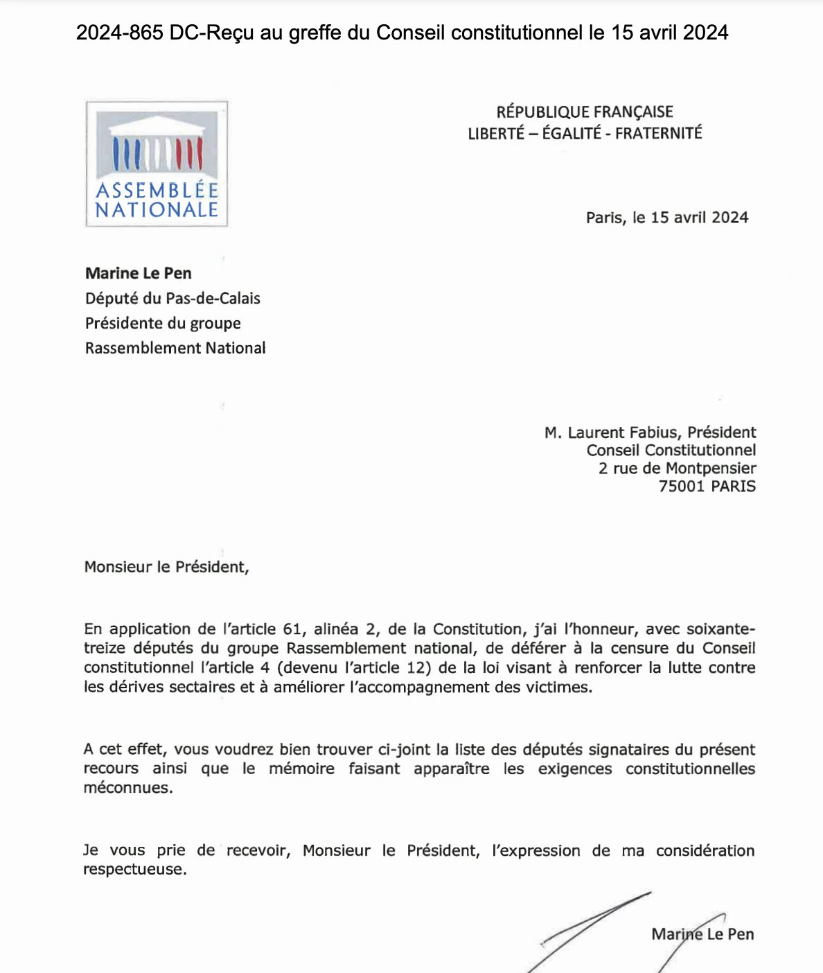 Les députés du @groupeRN_off ainsi que les sénateurs @lesRepublicainsont saisi le @Conseil_constit sur ce dangereux et liberticide article 4 de la loi sur les dérives sectaires qui vise à faire taire les futurs lanceurs d’alertes et les scientifiques. Au delà de toutes considérations partisanes, il est important de soutenir cette action, car cet article de loi est extrêmement liberticide, et n’a rien à voir avec une lutte contre des dérives sectaires