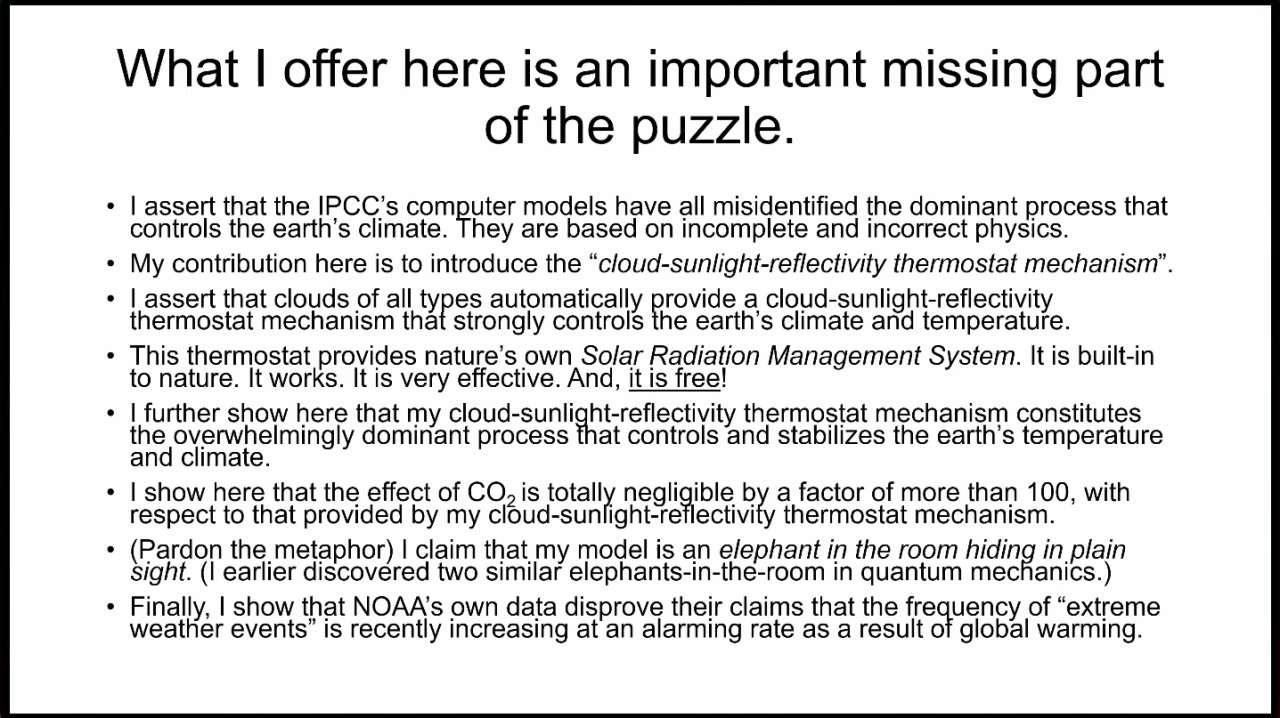 Je prétends que les propriétés remarquables des nuages ci-dessus constituent la pièce manquante du puzzle. Je peux affirmer en toute confiance qu’il n’y a pas d’urgence climatique. » Voir les diapositives de son discours sur le fil ci-dessous :