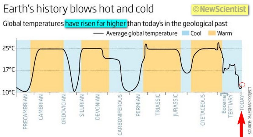 Tout graphique des températures à long terme de la planète Terre indique que les températures ont naturellement augmenté beaucoup plus haut qu’elles ne le sont aujourd’hui bien avant que le CO2 artificiel puisse être un facteur, révélant que le CO2 artificiel est une cause possible du réchauffement climatique qui n’est pas étayée par des preuves.