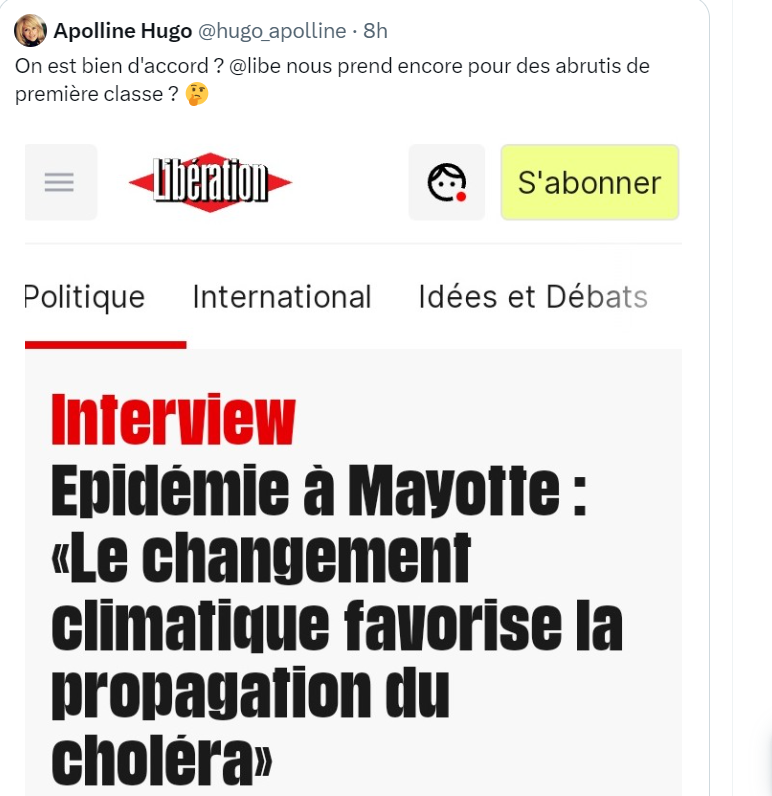 | Dans les territoires français de l’Océan indien, un premier cas de choléra confirmé a été enregistré le 18 mars 2024, chez une personne en provenance des Comores Un cas a également été enregistré à La Réunion le 20 mars, chez une personne ayant séjourné en Inde . Une épidémie de choléra est actuellement en cours en Union des Comores. La proximité avec Mayotte a conduit l’Agence régionale de santé (ARS) et la préfecture à mettre en place, dès février, un plan d’action visant à endiguer la transmission de la bactérie et son implantation sur le territoire mahorais.Le premier cas identifié à Mayotte a été pris en charge au sein de la cellule « choléra » du centre hospitalier mahorais, afin de stabiliser son état de santé.En parallèle, une opération a été menée au domicile de ce patient :pour identifier les cas contacts et coexposés et leur délivrer les premiers traitements ;pour procéder à la désinfection du foyer, conduire des analyses environnementales et diffuser les recommandations sanitaires aux personnes du voisinage. À La Réunion, la situation est très surveillée et les mesures de précaution nécessaires (dont le contact tracing) sont mises en œuvre. Contrairement à Mayotte, le risque de propagation sur le territoire est considéré de niveau faible. |