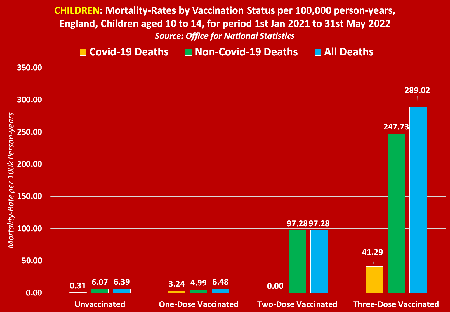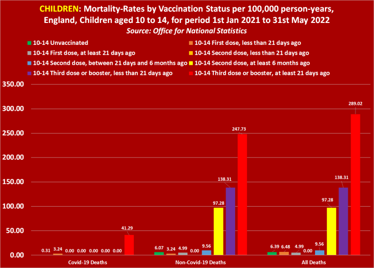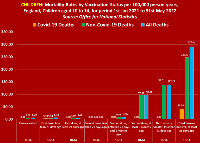 Concernant les décès dus au Covid-19, l’ONS révèle que le taux de mortalité parmi les enfants non vaccinés âgés de 10 à 14 ans équivaut à 0,31. Mais en ce qui concerne les enfants vaccinés à une dose, le taux de mortalité équivaut à 3,24 pour 100 000 années-personnes, et en ce qui concerne les enfants triplement vaccinés, le taux de mortalité équivaut au taux choquant de 41,29 pour 100 000 années-personnes.