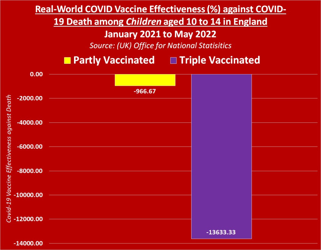 Les injections du Covid-19 s’avèrent avoir une efficacité négative réelle contre la mort de moins 966,67 % chez les enfants partiellement vaccinés, et une efficacité négative choquante contre la mort de moins 13 633,33 % chez les enfants triplement vaccinés.