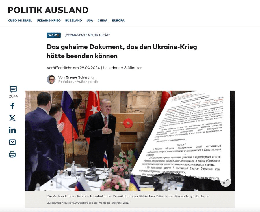 Mais que font les journalistes français, d’ordinaire si friands de « documents secrets » sur la Russie ?! Le 28 avril dernier, le quotidien allemand « Die Welt » révélait un projet d’accord de paix négocié par Kiev et Moscou au début de la guerre.