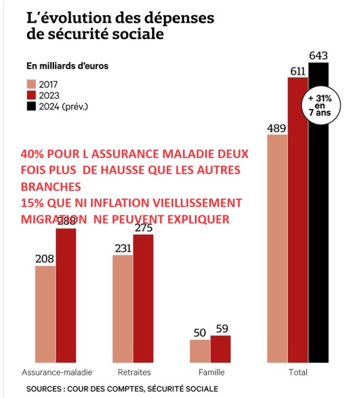 40%de hausse des dépenses maladie en 7 ans, mais 20% hausse que ni le vieillissement, le covid ou l’immigration ne peuvent expliquer alors vaccins ARNm ou réchauffement climatique?