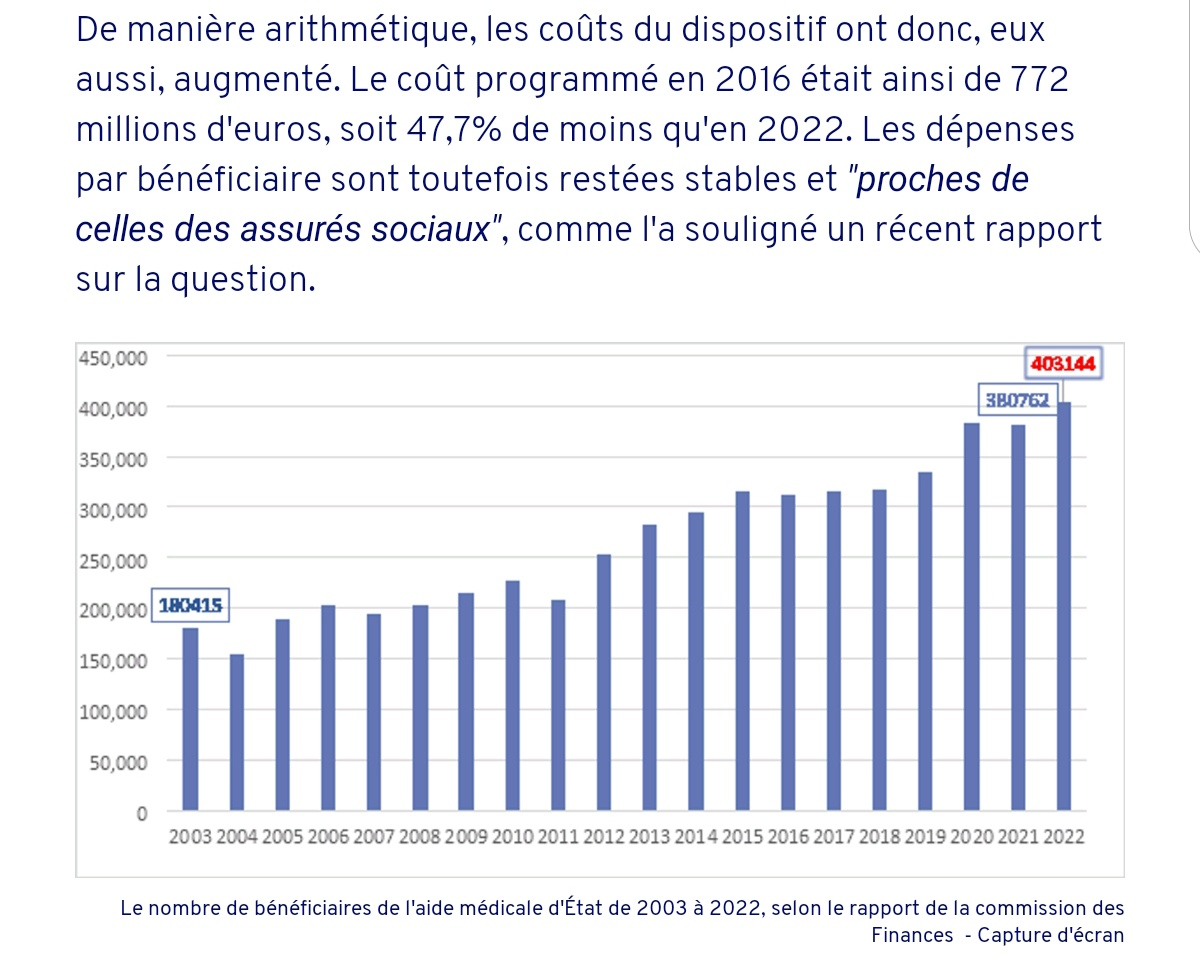 L’aide médicale d’Etat c ‘est 10% en plus depuis 2020 (augmentation du nombre de bénéficiaires de 100% en 20 ans) et 30% depuis 2017 Attention est elle prise en charge par l’Etat, pas par l’assurance maladie