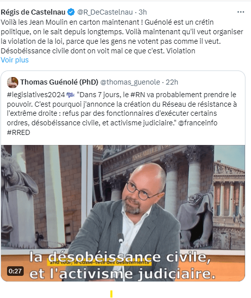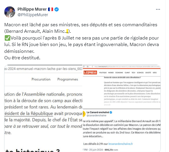 Dans tous les cas de figures, en regardant les « projections » (et pas que celle officieuses de nos journaleux serpillières adorés) il ressort partout que le nombre de députés RN et apparentés/associés sera en gros 2 fois supérieur à celui des autres groupes ou faction. La Macronie devrait perdre plus de la moitié de ses troupes (ça fait cher en 2 ans quand on se rappelle qu’ils avaient la majorité absolue avant les élections de 2022 !) et les gauchos réunis ne devraient guère faire mieux; voir une « photographie sans doute assez réaliste ici: https://www.touteleurope.eu/vie-politique-des-etats-membres/elections-legislatives-2024-quelle-repartition-des-sieges-dans-la-future-assemblee-nationale/