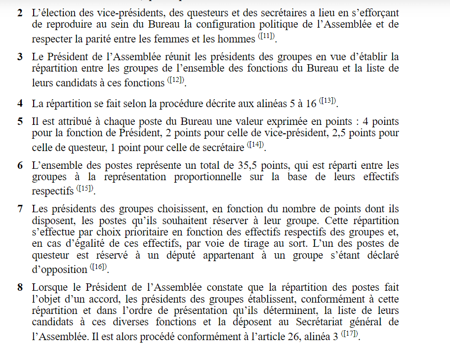Il a décidé de respecter les principes républicains dans le fonctionnement de l’Assemblée nationale et notamment d’appliquer l’article 10 de son règlement qui prévoit que : « L’élection des vice-présidents, des questeurs et des secrétaires a lieu en s’efforçant de reproduire au sein du bureau la configuration politique de l’assemblée ».