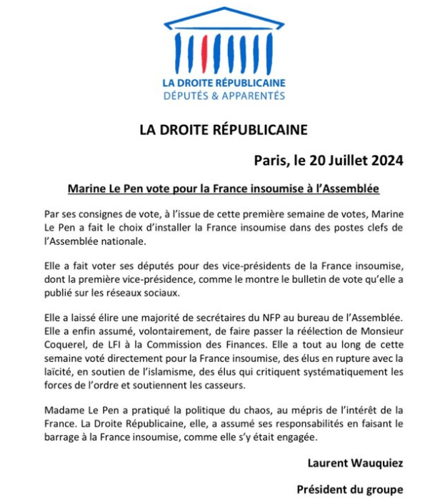Mais Laurent Wauquiez fait mieux. Il magouille en loucedé avec les macronards dont il se prétend l’opposition, et se fait attribuer deux vice-présidences alors que son groupe est cinq fois moins nombreux que celui du RN ! Qui fort démocratiquement, en a zéro ! Et voilà que cette crapule pousse maintenant des cris d’orfraie parce que ce RN qu’on ostracise, a pourtant respecté la règle républicaine qui voulait que soient attribués aussi un certain nombre de postes au NFP. Il faut lire son communiqué dans lequel il va jusqu’à accuser Marine Le Pen de soutenir l’islamisme !