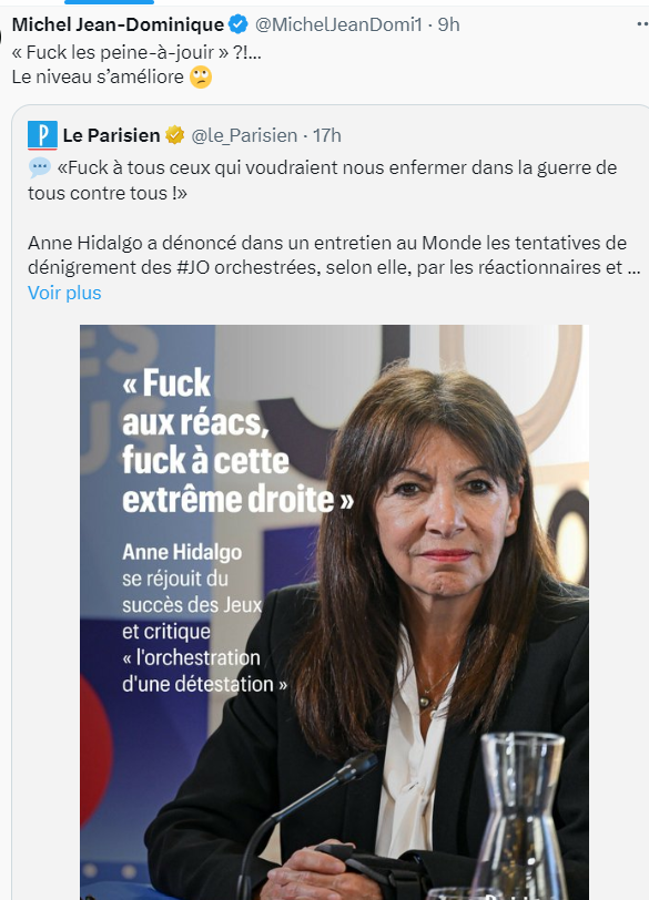 Evidemment quand on n’est pas de leur avis on est complotiste d’extrème droite et pro poutine. Il n’y a plus que la propagande officielle qu’il est interdit de remettre en cause. Eh bien non !!!! nous ne sommes pas d’accord avec les délires de ces fous et nous le faisons savoir. Tant pis pour Hidalgo qui refuse aux autres le droit d’avoir des valeurs et une opinion.