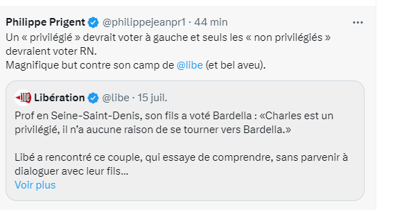 @geraldolivier1 journaliste expert des USA : le pb de la couverture Libération, ce qui est mis en avant c’est la violence alors ce qui doit être mis en avant, c’est la cible, Trump a été victime de cette tentative d’assassinat parce qu’il a été le Président qui a cherché à démanteler l’Etat Profond, il a derrière lui, toute une Amérique des oubliés, des laisser pour compte et qui a de fortes chances de retrouver le pouvoir et qui fait peur à toute cette gauche installée depuis des décennies et qui sait qu’avec lui à la tête de l’exécutif, leur confort de vie ne sera pas le même, voir leur contrôle d’un certain nombre d’institutions. C’est pas la violence, la violence est le moyen d’expression, ce qu’il faut bien comprendre ici, c’est le personnage qui est ciblé et pourquoi il l’est.