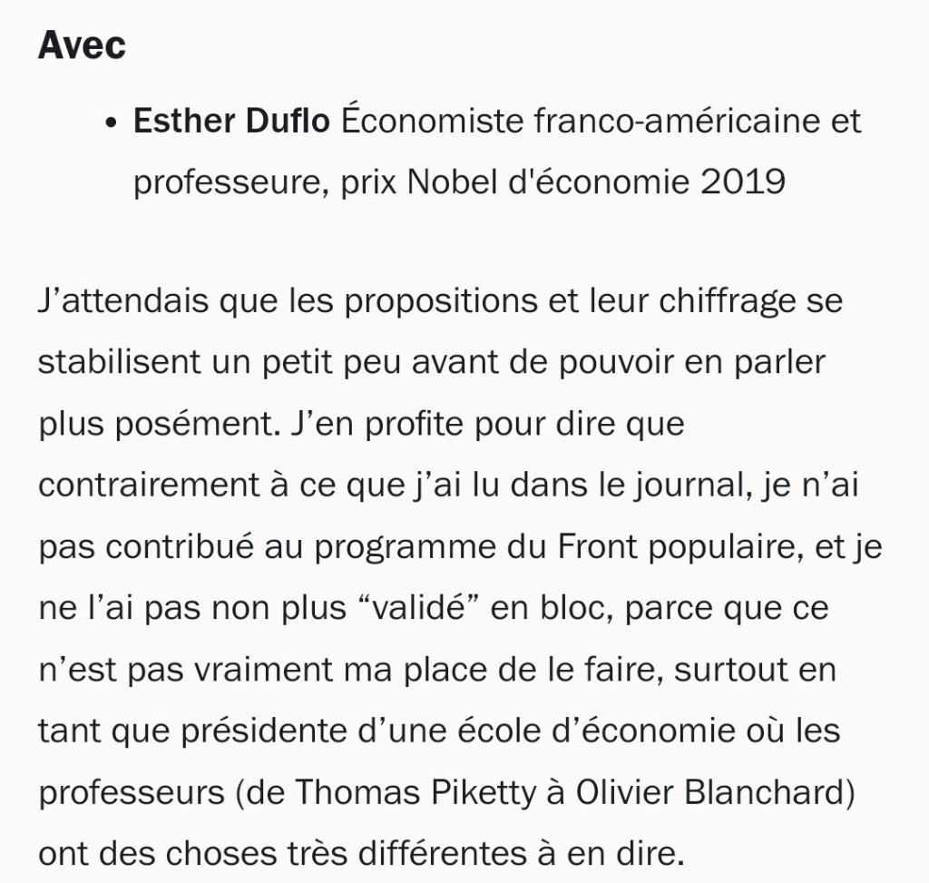 C’est vraiment dommage qu’on apprenne après l’élection que la NFP a menti et que non, Esther Duflo n’a jamais validé leur programme économique. Pourquoi les journalistes les ont laissé l’affirmer sur tous les plateaux