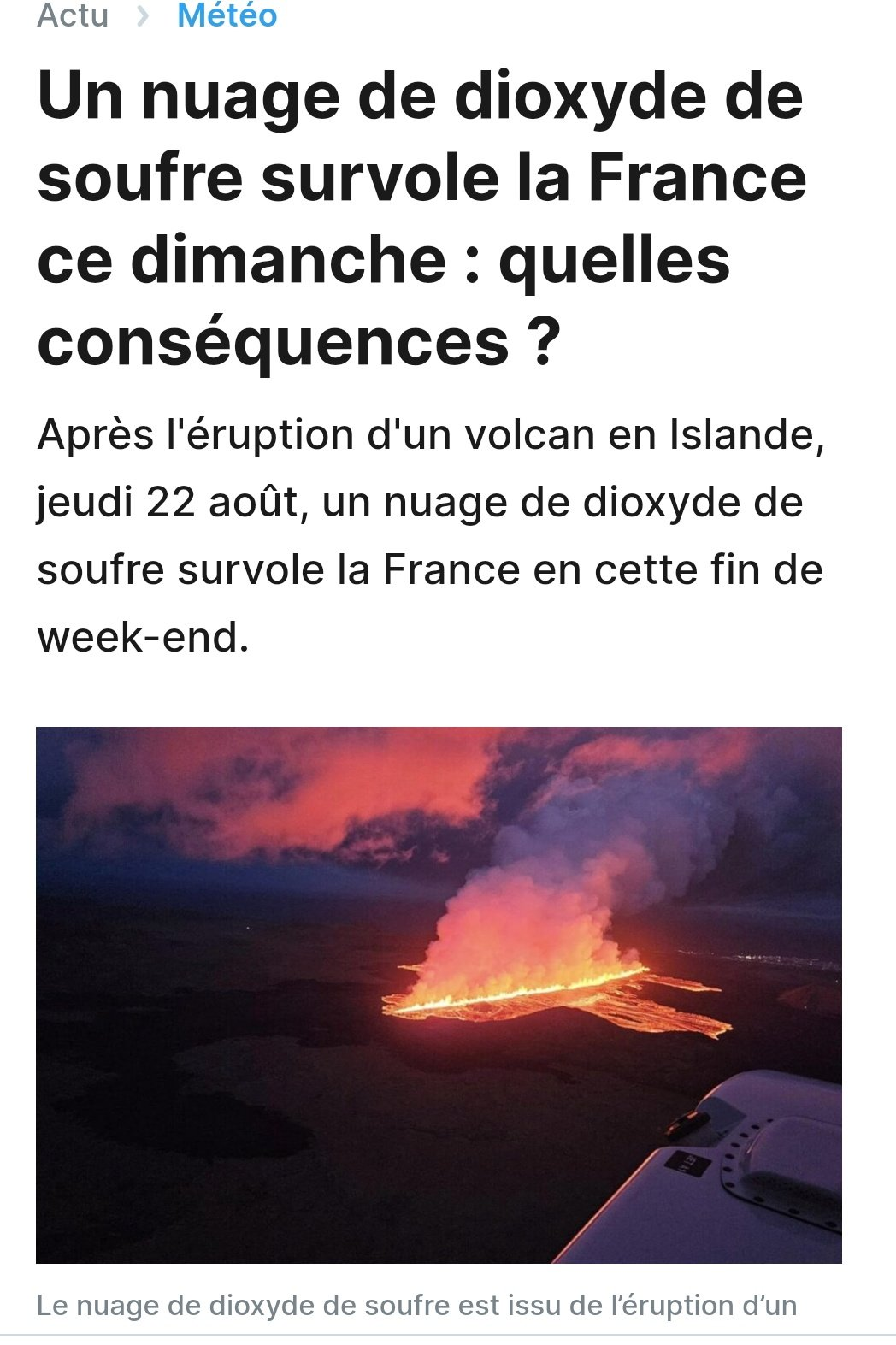 Un nuage de dioxyde de soufre a survolé le nord de l’Europe et a commencé à s’installer dans le ciel de France dans la nuit du samedi 24 au dimanche 25 août, Il provient du volcan islandais Sundhnuksgigarod qui est entré en éruption jeudi.