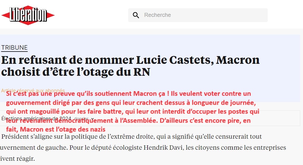 Ils veulent voter contre un gouvernement dirigé par des gens qui leur crachent dessus à longueur de journée, qui ont magouillé pour les faire battre, qui leur ont interdit d’occuper les postes qui leur revenaient démocratiquement à l’Assemblée. D’ailleurs c’est encore pire, en fait, Macron est l’otage des nazis. Le pire, et j’ai pu le vérifier, la plupart des gens qui profèrent ce genre de conneries sont de bonne foi. Avec ses 27 % au premier tour et de ses 180 députés au second grâce aux voix macronistes, ils croient dur comme fer que le NFP a « gagné » les législatives et que la nomination de Castets est un dû. Que sinon comment que c’est pas trop un coup d’État