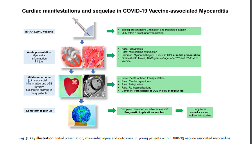 les lésions myocardiques telles que mises en évidence par la LGE sur l’IRM lors de la présentation initiale sont courantes, en particulier chez les adolescents plus âgés qui se présentent après leur première ou deuxième dose de vaccins à ARNm. Bien que les séquelles cliniques à moyen terme soient rares et que la gravité de la LGE diminue avec le temps, la persistance de la LGE lors du suivi chez la plupart des patients justifie une surveillance clinique continue, des recherches supplémentaires et des études à plus long terme dans ce sous-ensemble de patients.