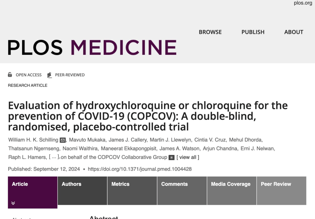Si ces résultats avaient été disponibles à l’époque, il aurait été possible de déployer plus largement ces 4-aminoquinolines modérément efficaces, peu coûteuses, disponibles et sûres. Pour mettre en perspective l’efficacité prophylactique modérée de l’HCQ/CQ, l’OMS a déclaré initialement que les vaccins COVID-19 avec une efficacité protectrice d’au moins 30 % pris en considération. » https://journals.plos.org/plosmedicine/article?id=10.1371/journal.pmed.1004428…