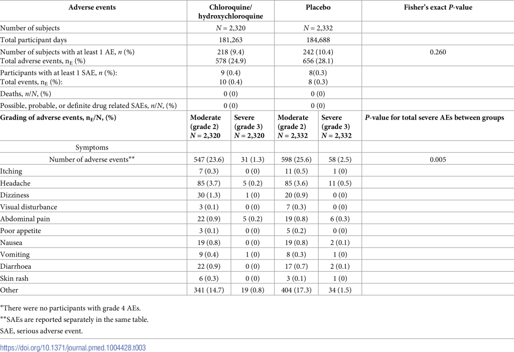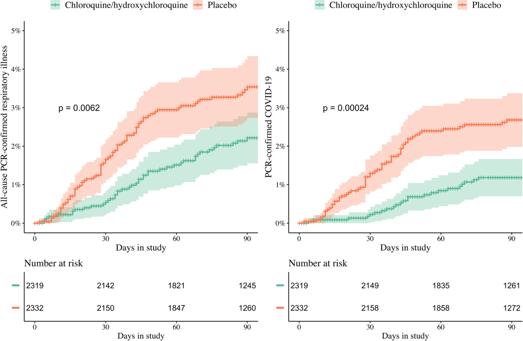 Cet essai multinational de chimioprévention de la COVID-19, randomisé et en double aveugle, à grande échelle, fournit des preuves solides de l’innocuité de l’hydroxychloroquine et de la chloroquine administrées quotidiennement pendant 3 mois (en moyenne 2,4 mg base/kg/jour).