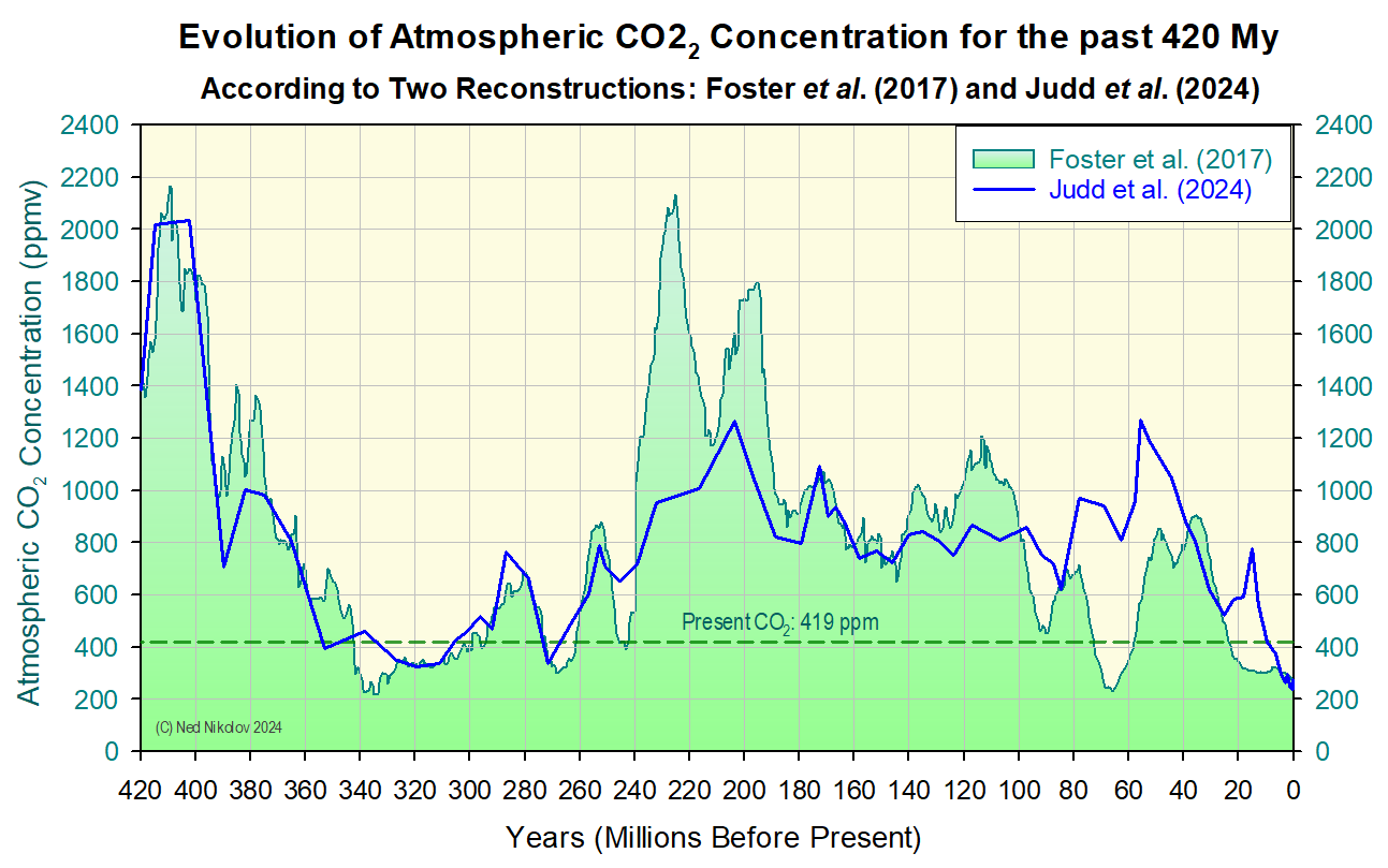 Une nouvelle étude de Judd et al. (2024 : https://science.org/doi/10.1126/science.adk3705… ) affirme que l’atmosphère CO2 contrôlait le climat du Phanérozoïque au cours des 485 millions d’années passées. Cependant, leurs propres données publiées sur GitHub (https://github.com/EJJudd/PhanDA/blob/main/5_Outputs/PhanDA_GMSTandCO2_percentiles.csv… ) réfutent cette affirmation.