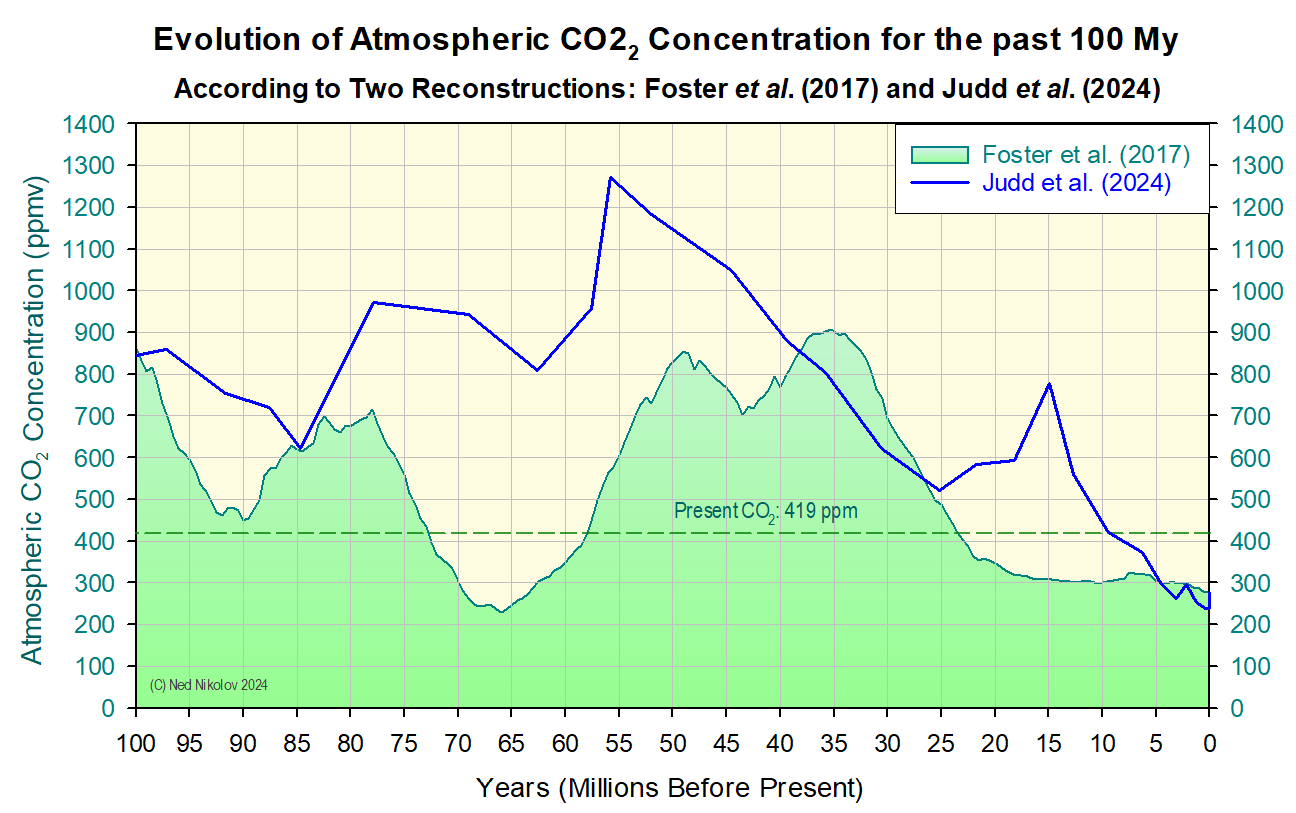 Voici la différence entre les enregistrements de CO2 des 100 derniers millions d’années publiés par Foster et al. (2017) et Judd (2024). Judd et al. ont FUGUÉ le record paléo original de CO2 basé sur 4 proxys différents pour le faire correspondre à une théorie préconçue qu’ils vénèrent, car elle soutient leurs porteurs.
