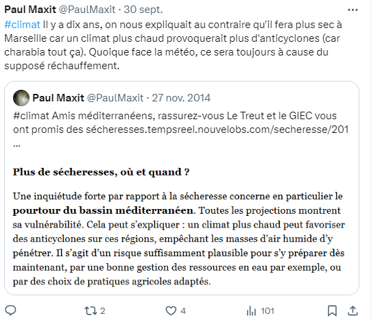 Mais n’est-ce pas là le cycle « normal » de l’eau, qu’on rencontre un peu partout avec dans certaines régions des amplitudes plus fortes. Quelle est donc la variation d’ampleur d’un cyclone pour une élévation de température de 1,5°C de l’eau de surface; ça bien sûr ils savent pas ! D’autant plus que c’est localisé, voire très très localisé et sans doute assez bref côté… temporel. Ah mais oui, le temps … journalistique, celui qui fait le buzz…