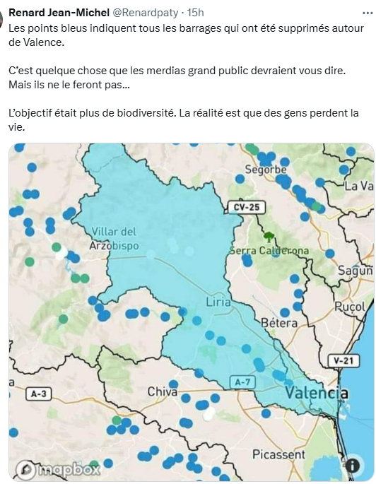 Les points bleus indiquent tous les barrages qui ont été supprimés autour de Valence. C’est quelque chose que les merdias grand public devraient vous dire. Mais ils ne le feront pas… L’objectif était plus de biodiversité. La réalité est que des gens perdent la vie.