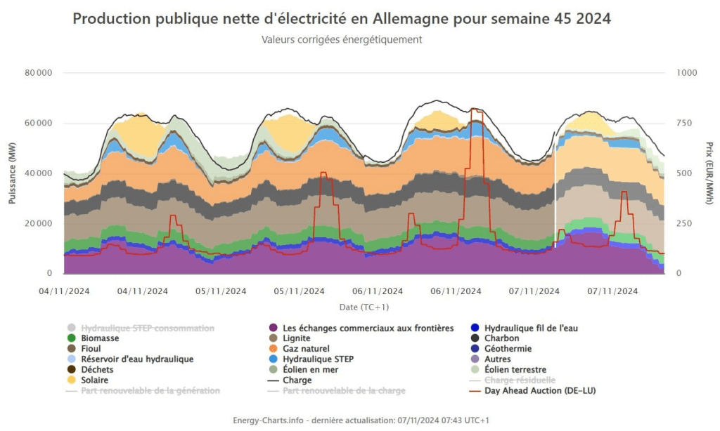 Production énergétique Allemagne du 2 au 6 novembre 2024. Peu de vent, soleil absent: 57% de l’#électricité consommée en Allemagne provenait de ses centrales à gaz/charbon. Hier, en 1 heure seulement, l’élec. allemande émettait 35 000 tonnes de CO2 (vs 4000 pour la française