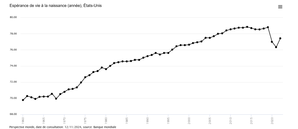 En 2022, l’espérance de vie des Américains était estimée à 77,5 ans, en baisse de 1,3 an par rapport à 2019.
