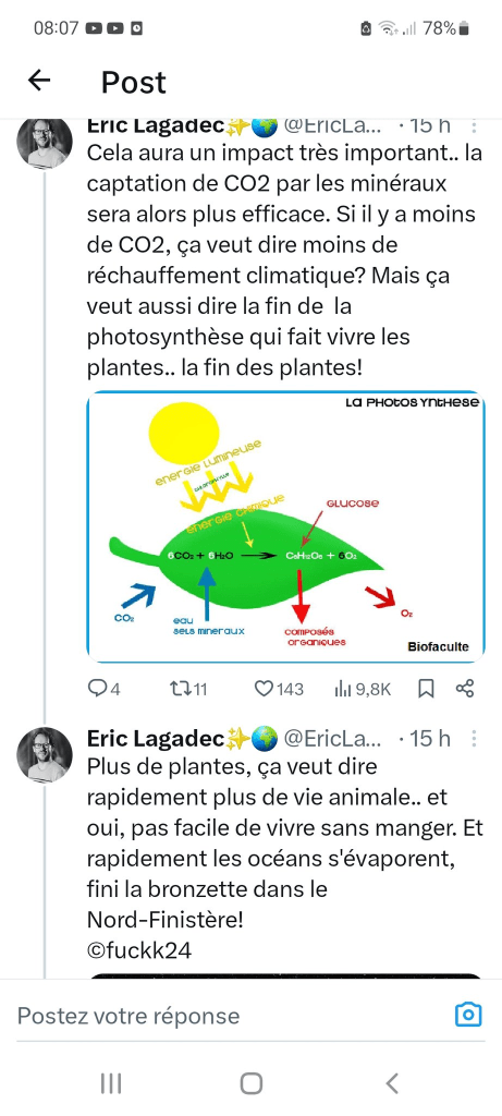 Mon fils ingénieur en environnement aquatique me l’a souvent dit , malheureusement il n’a pas réussi à trouver un emploi digne de sa passion pour l’instant, pourtant en Bretagne où il a emménagé avec sa compagne, on pourrait penser qu’il y a des structures environnementales océaniques, mais même avec son expérience professionnelle de plongée de haut niveau, il semble ne rien avoir pour protéger la vie marine là bas..c’est quand même incroyable… A part des cop toutes plus coûteuses et polluantes les unes que les autres, aucun travail sur le terrain, fautes de budgets probablement ? Il n’existe en réalité pas de volonté politique d’aucune sorte pour agir réellement, que du blabla pour taxer toujours plus les gens et leur fourguer des installations aussi coûteuses, polluantes et néfastes in fine pour eux comme pour l’environnement, éoliennes, pompes à chaleur, panneaux solaires made in china, véhicules électriques etc etc..que du business ! Ça me révolte, alors de mon côté a mon petit niveau je replanter de arbres et autres pour faire ma part de colibri, car je n’ai pas de moyens autres pour protéger la nature..et mon fils se morfond de ne pas pouvoir agir concrètement après toutes ces années d’études et de certification de plongeur professionnel coûteuses et sans travail in fine ! Ce monde est fou et superficiel, les gens préfèrent les blacks friday a leur avenir et celui de leurs enfants…c’est désespérant