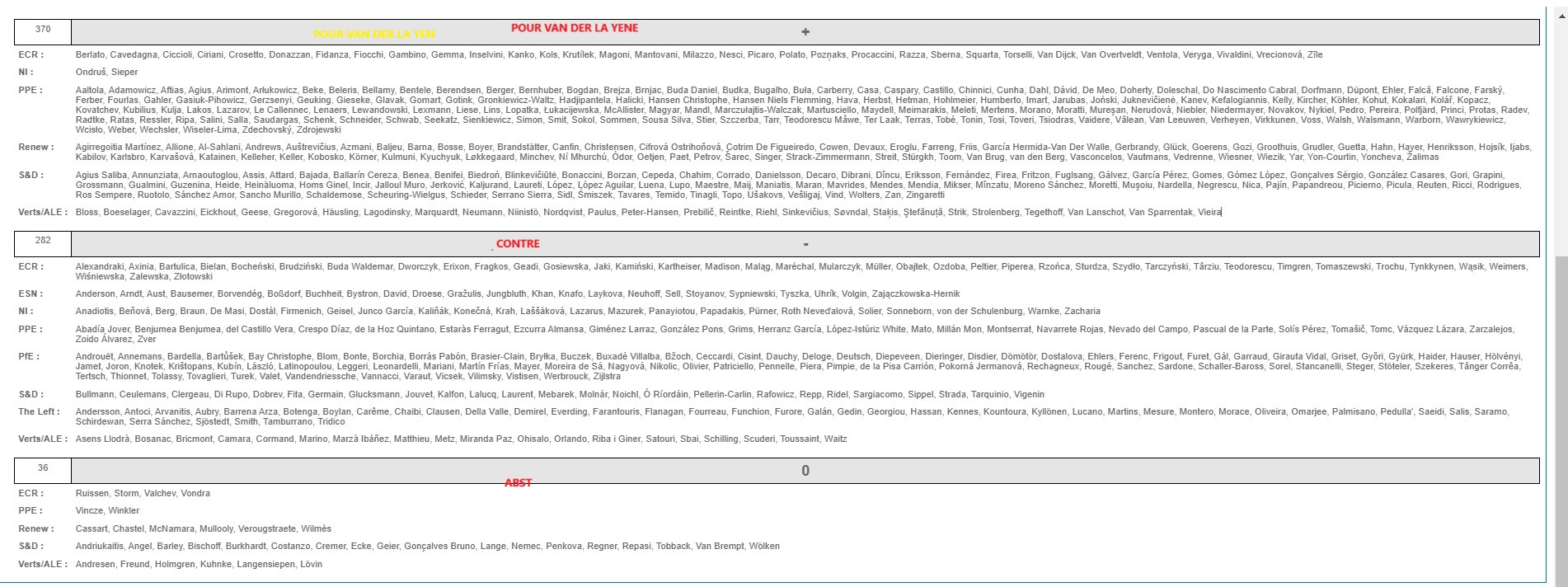 Je suis un peu surpris par cet article. Le vote pour cette élection est à bulletin secret (https://www.europarl.europa.eu/doceo/document/PV-10-2024-07-18-ANN-1_EN.html ), les totaux des votes pour et contre que vous indiquez ne correspondent pas aux totaux officiels tels qu’on peut les trouver sur le site https://www.europarl.europa.eu/doceo/document/PV-10-2024-07-18-ITM-008_EN.html.