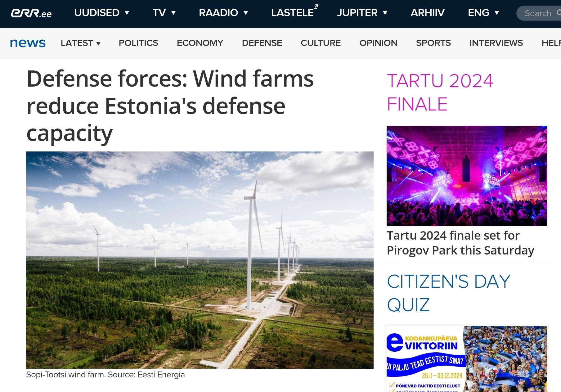 Les centrales éoliennes réduisent la capacité de défense de l’Estonie – ERR Le chef du centre de renseignement des forces armées estoniennes, le colonel Ants Kivisild, et le commandant des forces navales du pays, le contre-amiral Ivo Värk, ont déclaré que la construction de parcs éoliens réduisait la capacité de défense de l’Estonie car elle perturbait le fonctionnement des stations radar.