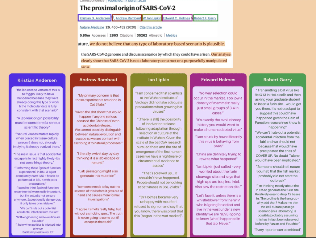 En raison des déclarations privées des auteurs contredisant leurs conclusions scientifiques, qui ont conduit à une censure mondiale de la possibilité d’une fuite de laboratoire, Nature Medicine devrait retirer l’article « Origine proximale ».