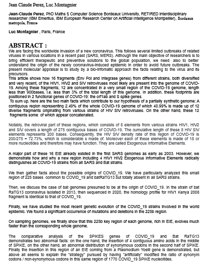 « Dans plusieurs publications, par exemple dans l’étude des chercheurs de l’Indian Institute of Technology de New Dehli basée sur les génomes des patients, recueillis dans des bases de données mondiales, il est démontré que le SARS -CoV-2 n’est pas seulement un hybride entre le virus de la chauve-souris et le virus du pangolin. Mais, à l’intérieur, il y a de petits inserts de résidus d’acides aminés du virus VIH-1, responsable du sida. La présence de ces inserts dans un virus développé dans la nature ne pourrait jamais se produire. Et, ce n’est pas tout. Le génome du SARS -CoV-2 présente une autre modification sur ce qu’on appelle le furin intracellulaire, comme le confirment deux études, l’une Chinoise, l’autre franco-canadienne. Les deux inserts ont une fonction spécifique : l’insert VIH-1 permet au SARS-Cov-2 de s’ancrer à la cellule humaine et de pénétrer dans la cellule. Il est donc vraisemblablement responsable de la forte infectivité du virus. La modification du site de clivage furinique permet au virus de se multiplier dans la cellule et le rend hautement pathogène ».