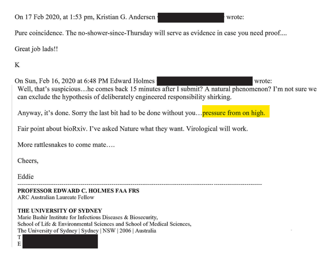 Les messages divulgués des auteurs de l’article « Origine proximale » de 2020, qui niaient l’origine du laboratoire de COVID-19, exposent la fraude scientifique et l’inconduite alors qu’ils expriment leur incrédulité envers les propres conclusions de leur article.