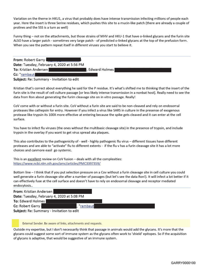 « Transmettre un RatG13 semblable à un virus de chauve-souris dans des cellules HeLa, puis demander à votre étudiant diplômé d’insérer un site de furine… vous y mènerait. Ce n’est pas cinglé de suggérer que cela aurait pu se produire étant donné la recherche sur le gain de fonction dont nous savons qu’elle est en cours. »