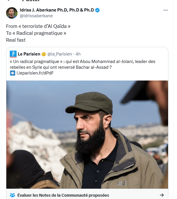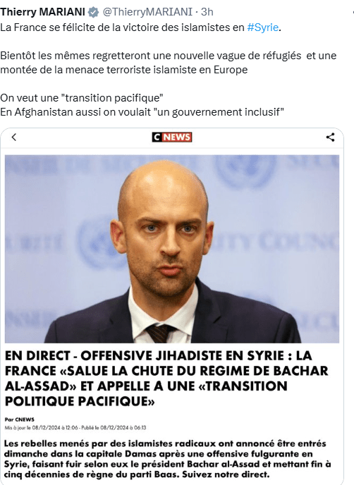Le systeme se félicite de la victoire des islamistes en Syrie.. Et après ils pleurent hypocritement les femmes afghanes et iraniennes (bientôt syriennes)